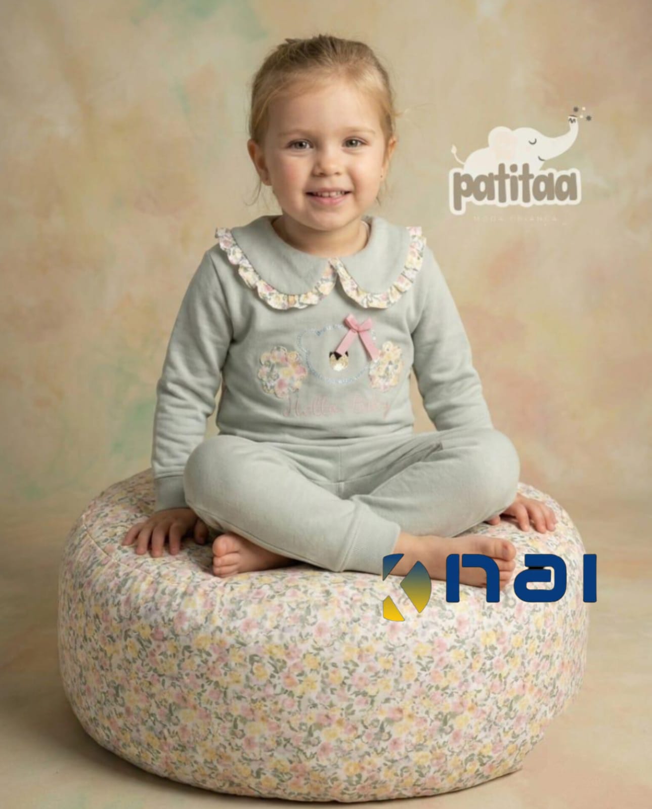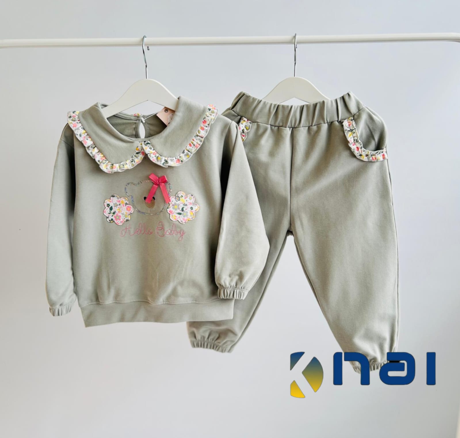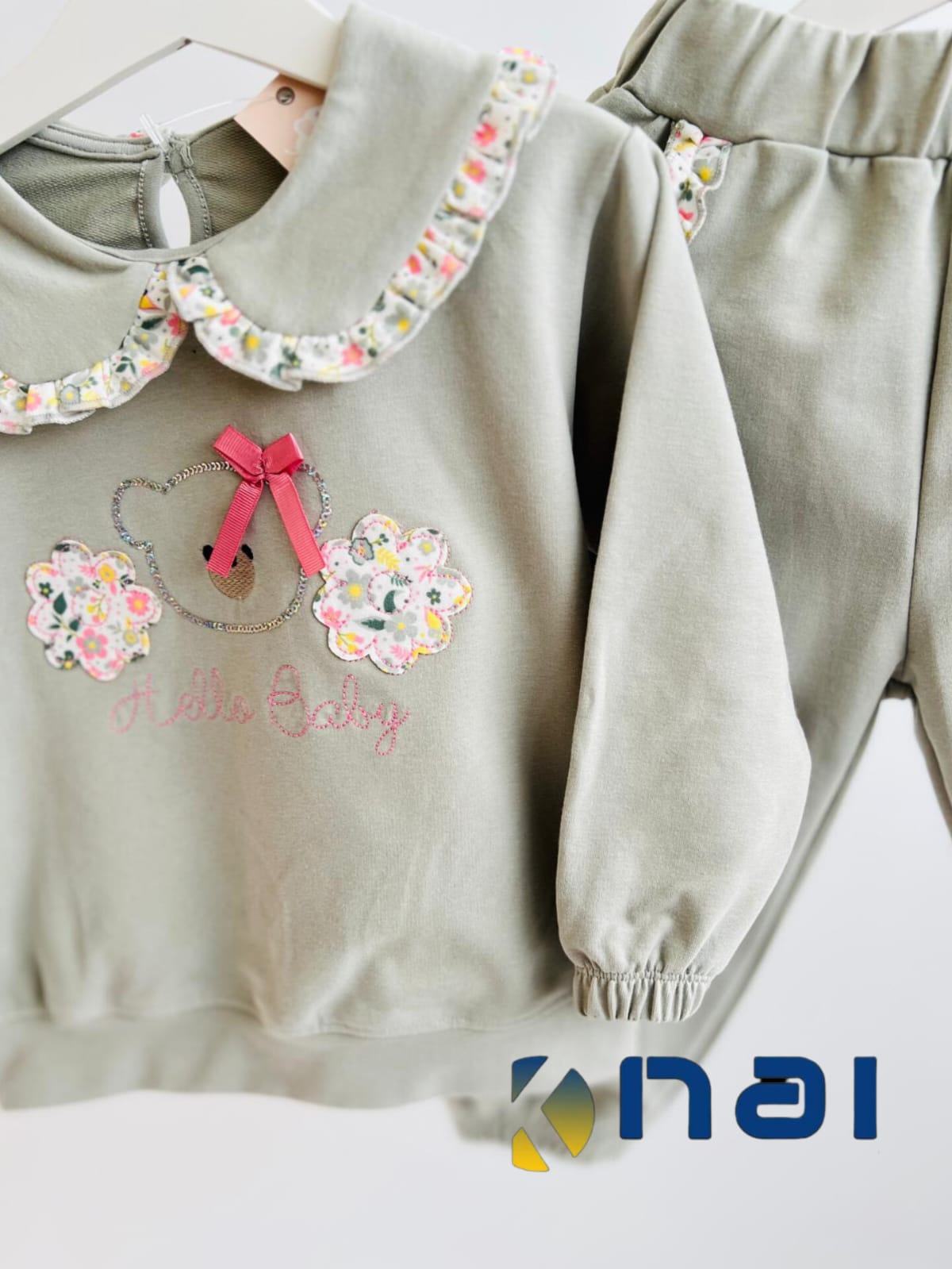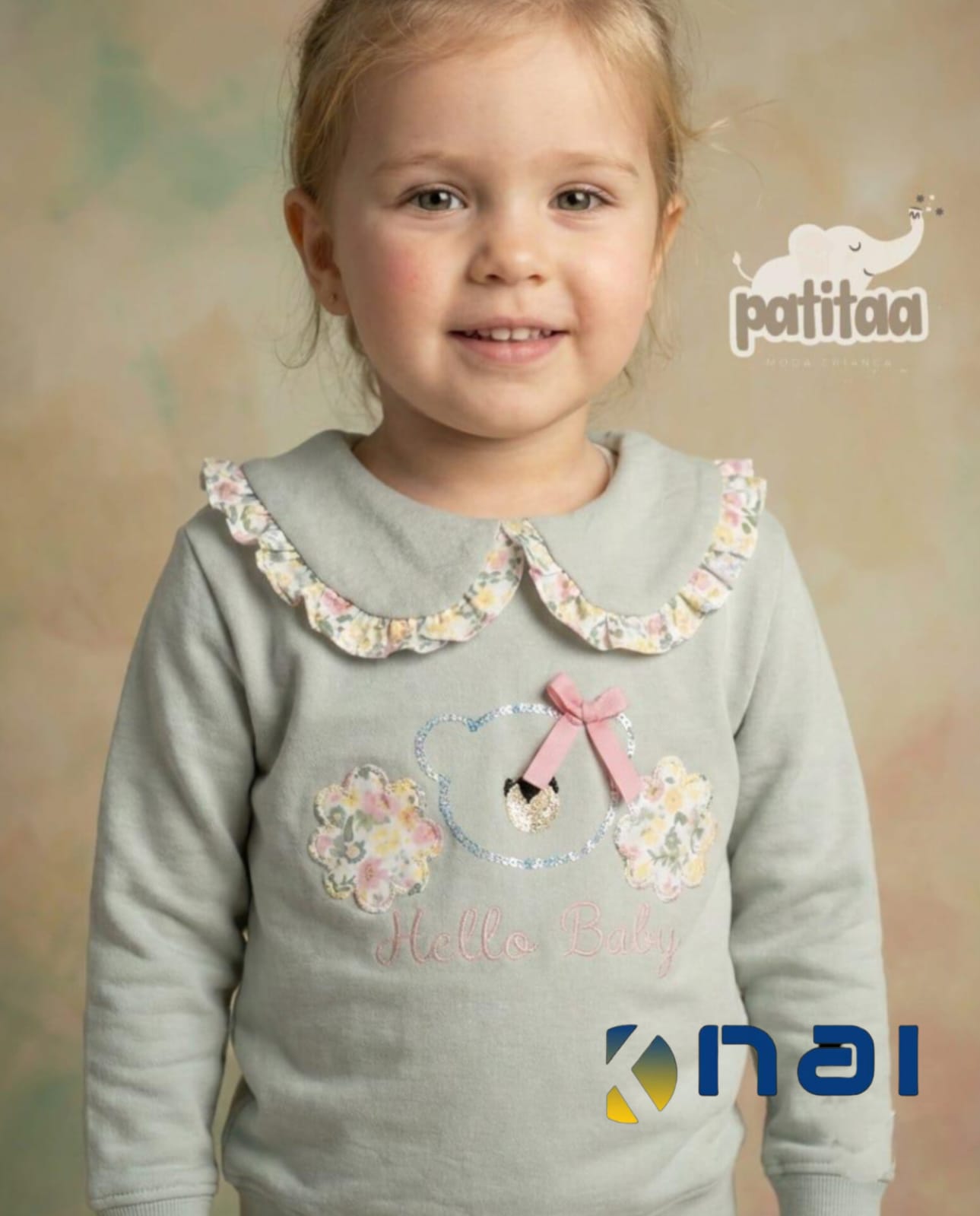 ❤️ O que torna este conjunto especial: Gola de Boneca: Uma gola trabalhada com folhos em padrão floral que ilumina o rosto da criança e botão nas costa para melhor vestir e despir. Detalhes Encantadores: Aplicação central "Hello Baby" com bordados florais e um laço de cetim rosa para um acabamento premium. Conforto Total: Calças com cintura elástica e punhos ajustados, ideais para o dia a dia e para manter as fraldas no lugar com conforto. Praticidade: Acabamento com folhos nos bolsos das calças, mantendo a harmonia de todo o conjunto.