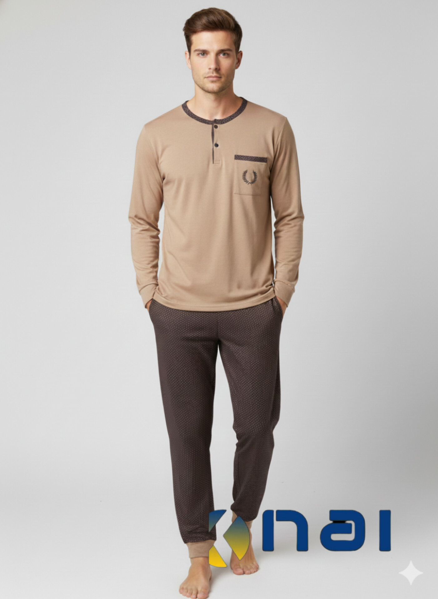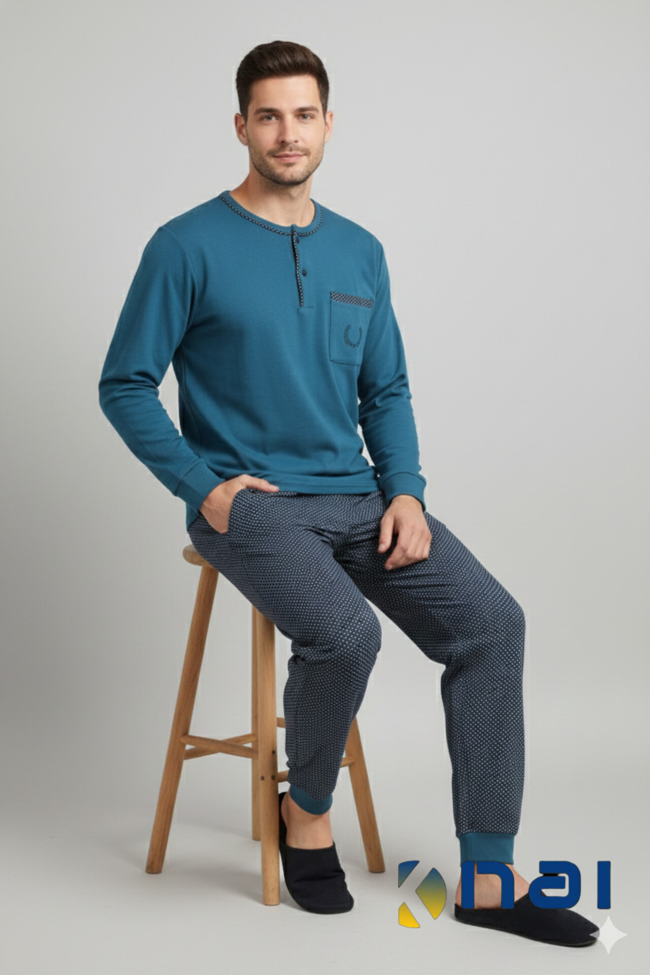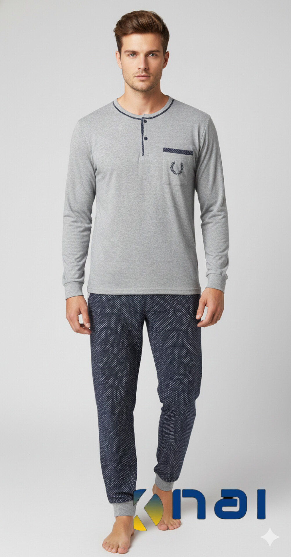Pijama em malha 100% algodão cardado de excelente qualidade. Camisola com punho na manga, botões e debroado á volta do decote da camisola no padrão da calça. Calça com elástico no cós, bolsos laterais e punho na perna.