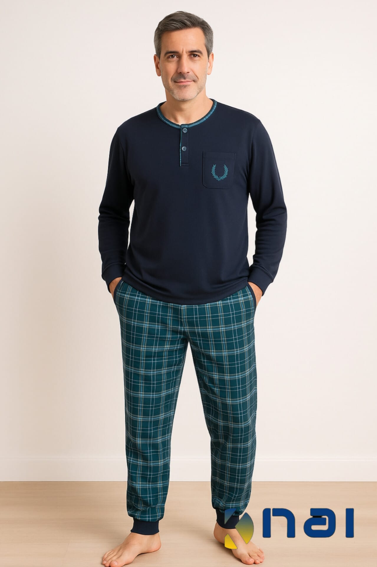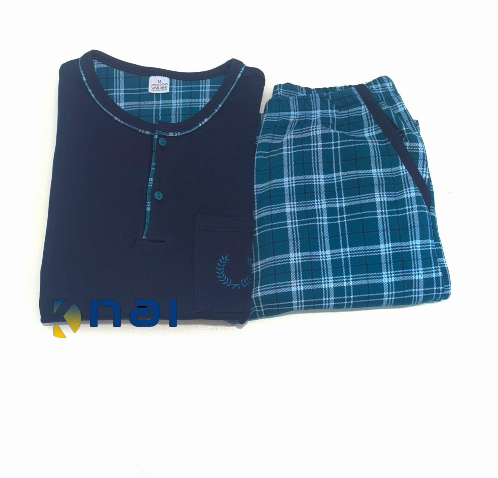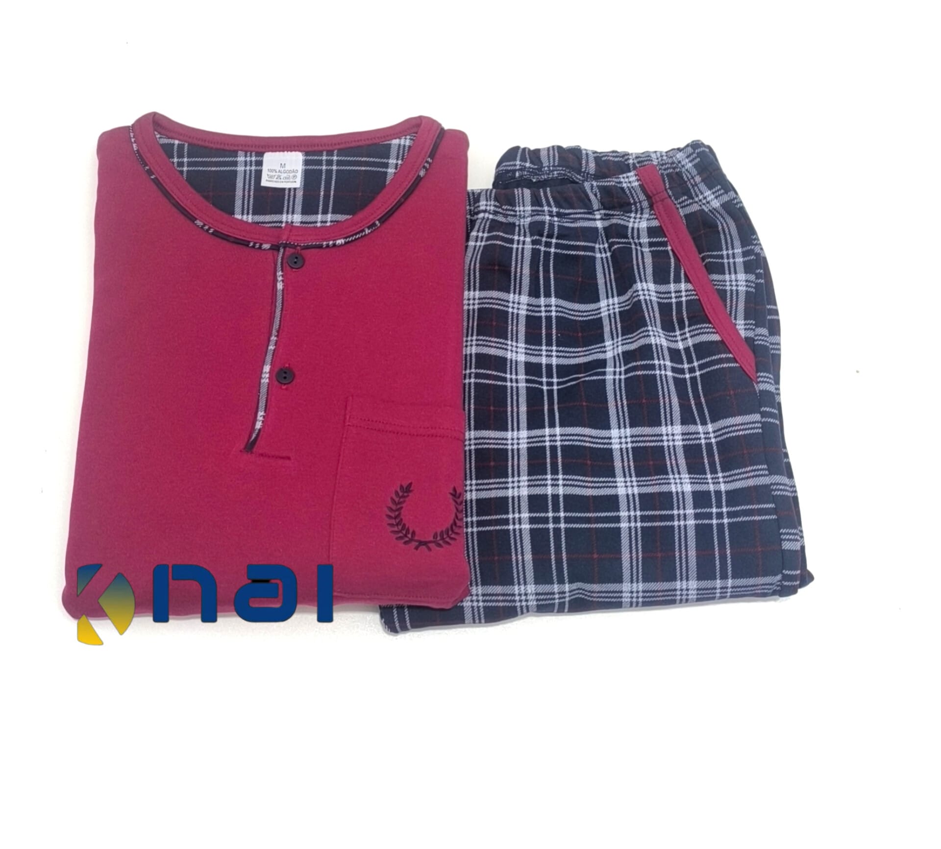 Pijama cardado confeccionado em malha 100% algodão de excelente qualidade. Camisola com dois botões, punhos nas mangas e bolso com pequeno bordado. Calça ao xadrez, punho suave e bolsos laterais.