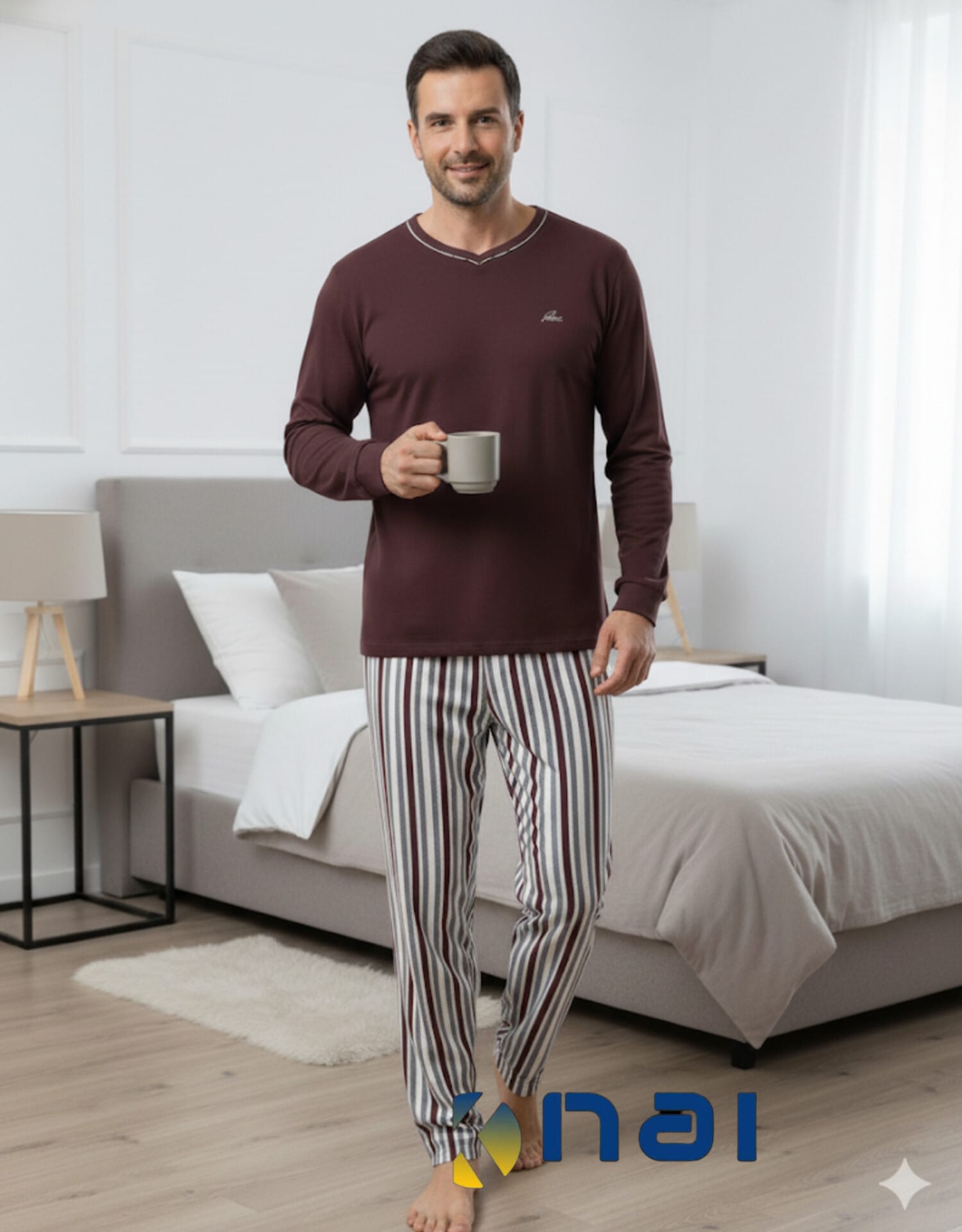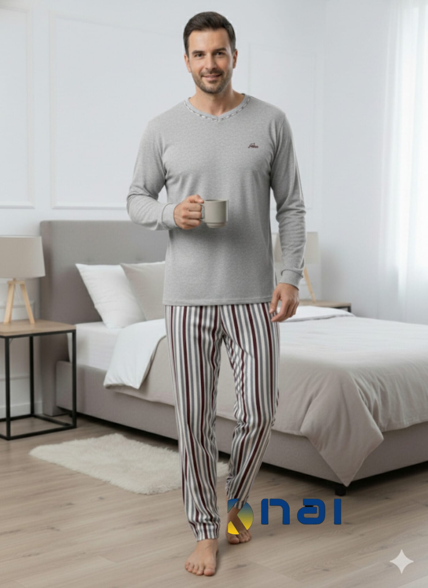 Pijama em malha 100% algodão cardada muito macia e quentinha. Camisola com decote em V (discreto), pequeno bordado no peito e punhos nas mangas. Calça com elástico no cós e punho na perna.