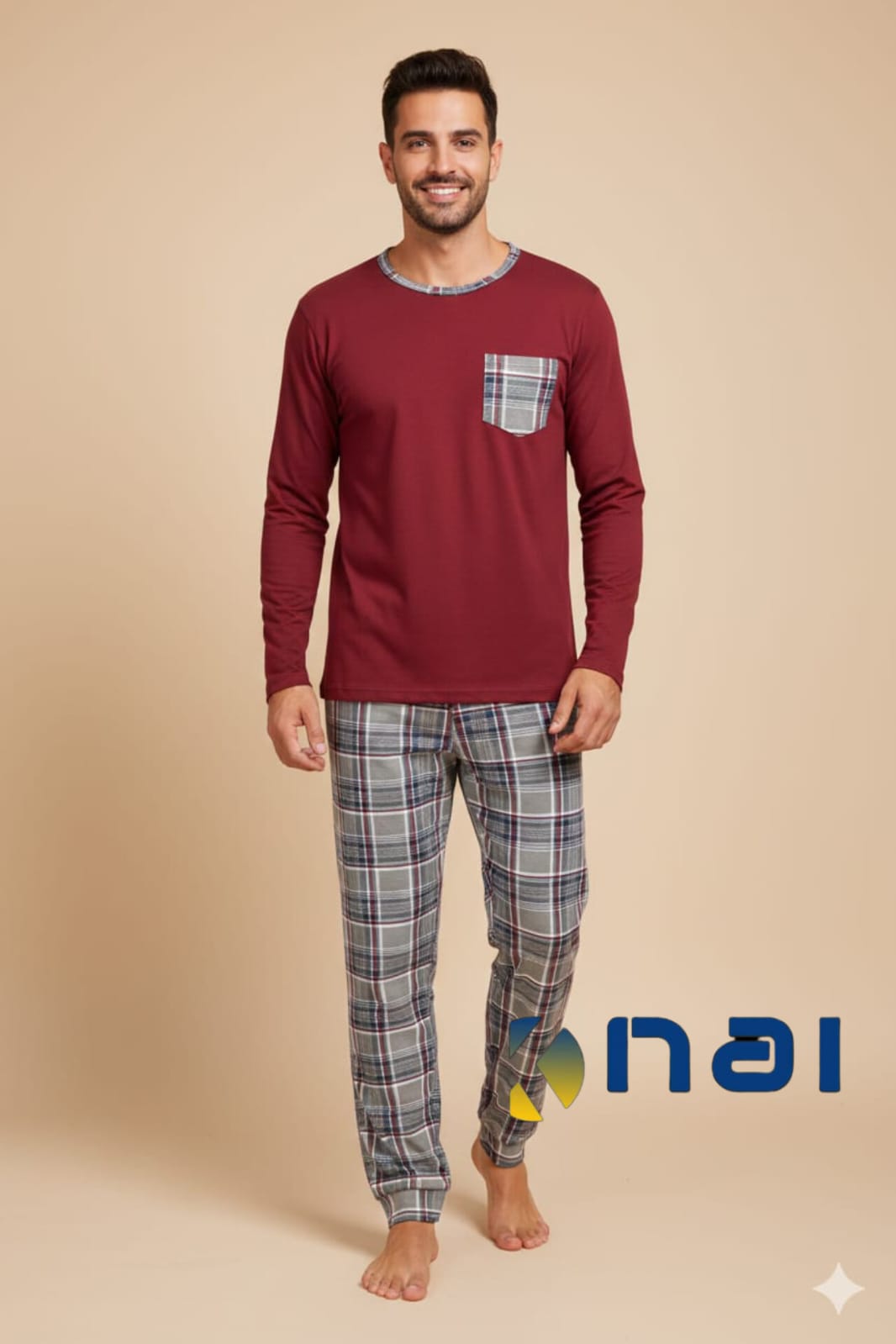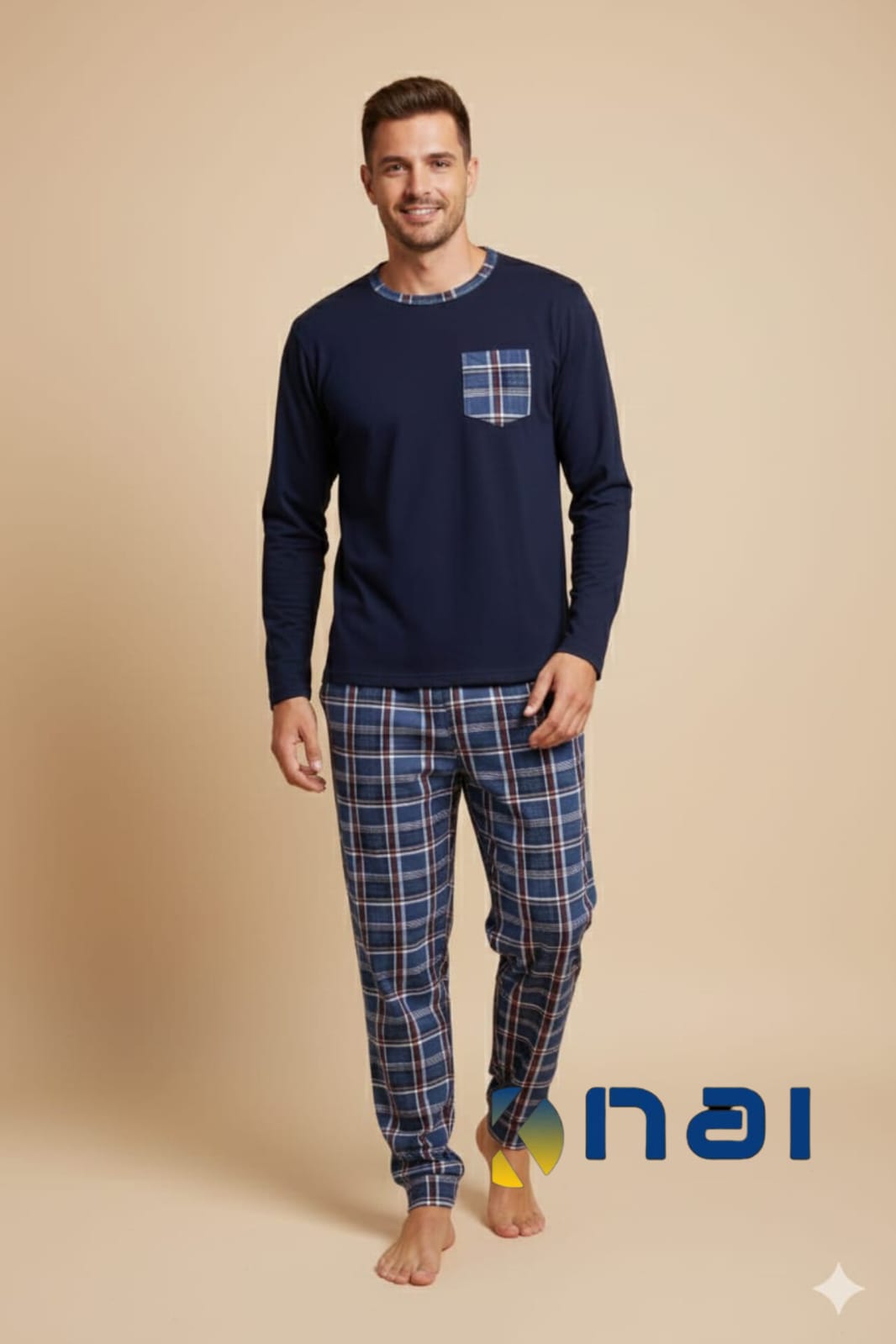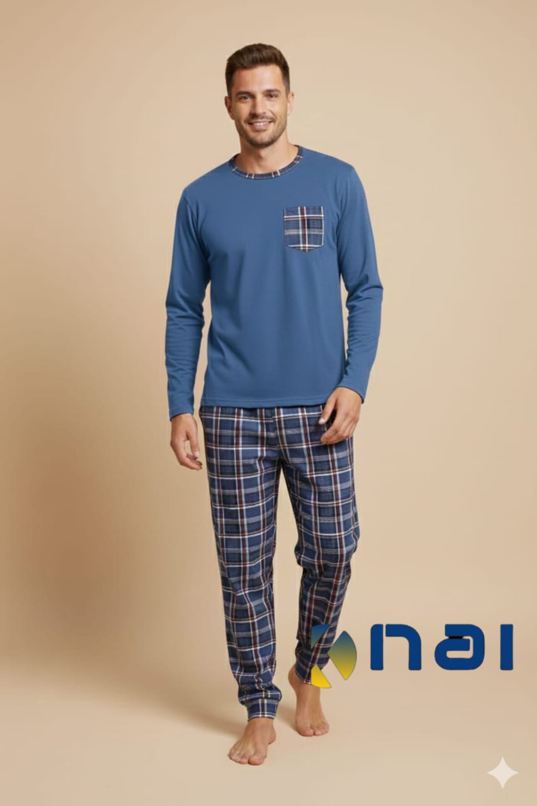 Pijama em malha 100% algodão cardado macia e quentinha. Camisola de decote redondo com bolso no peito. Calça com elástico no cós e punho suave na perna.