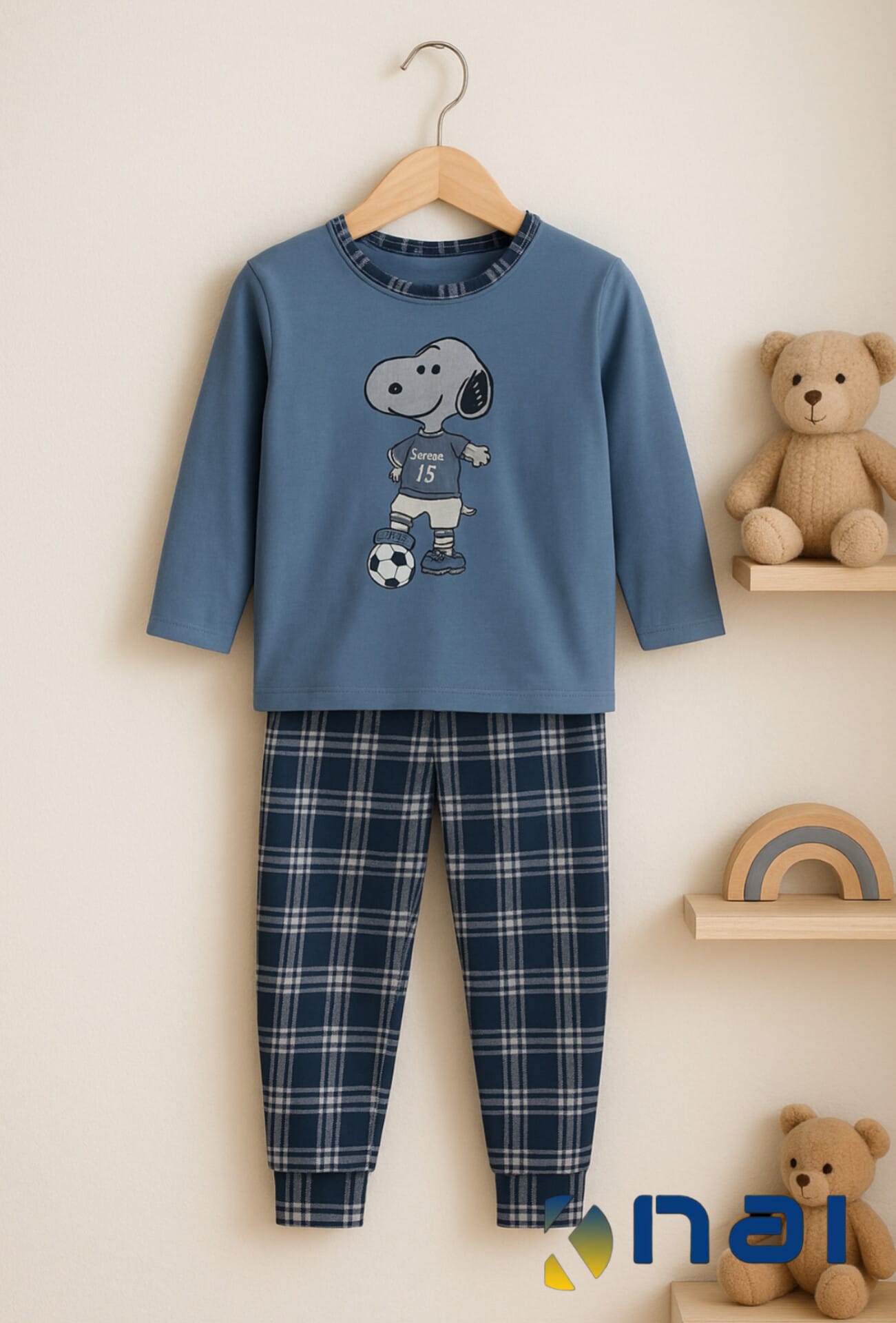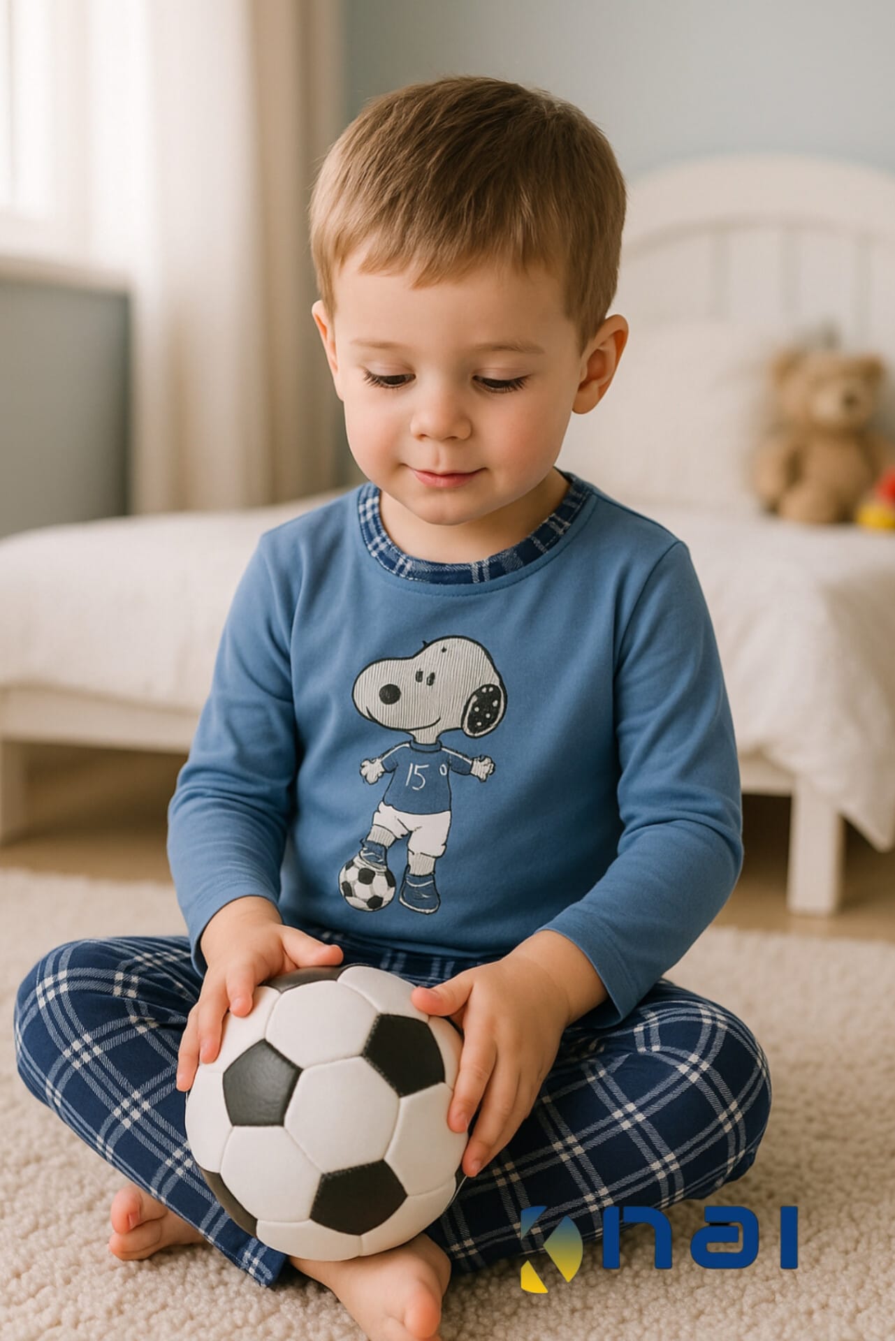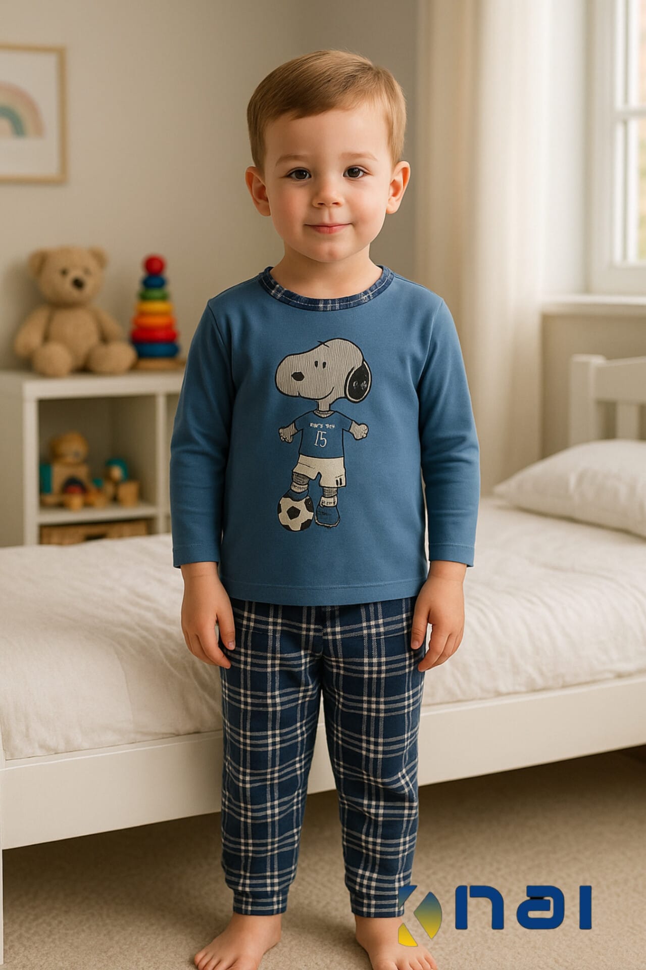 Camisola de decote redondo com gola em contraste. Camisola com estampa do Snoopy a jogar futebol e punhos nas mangas. Calça ao xadrez com elástico no cós e punho nas pernas.