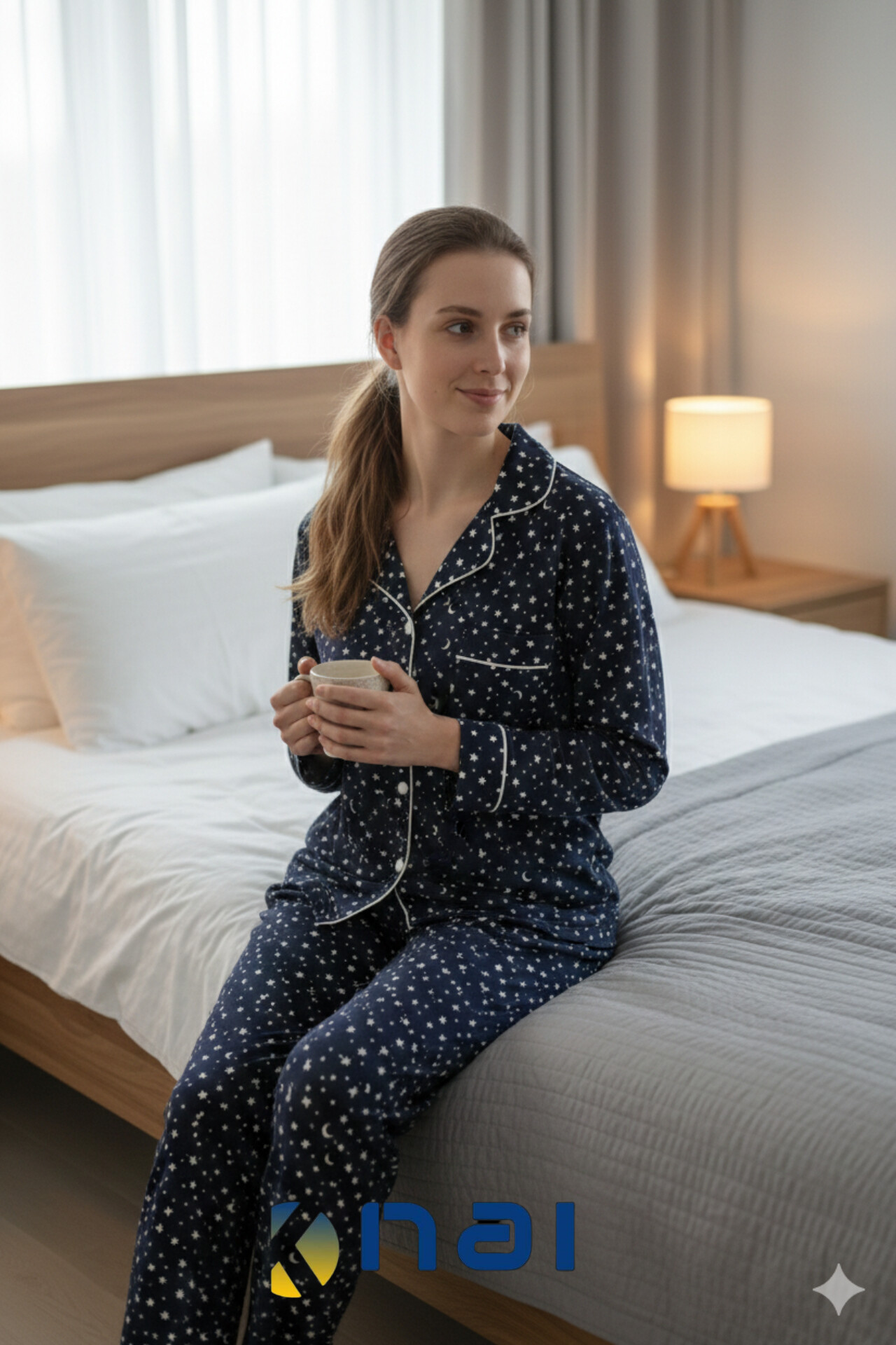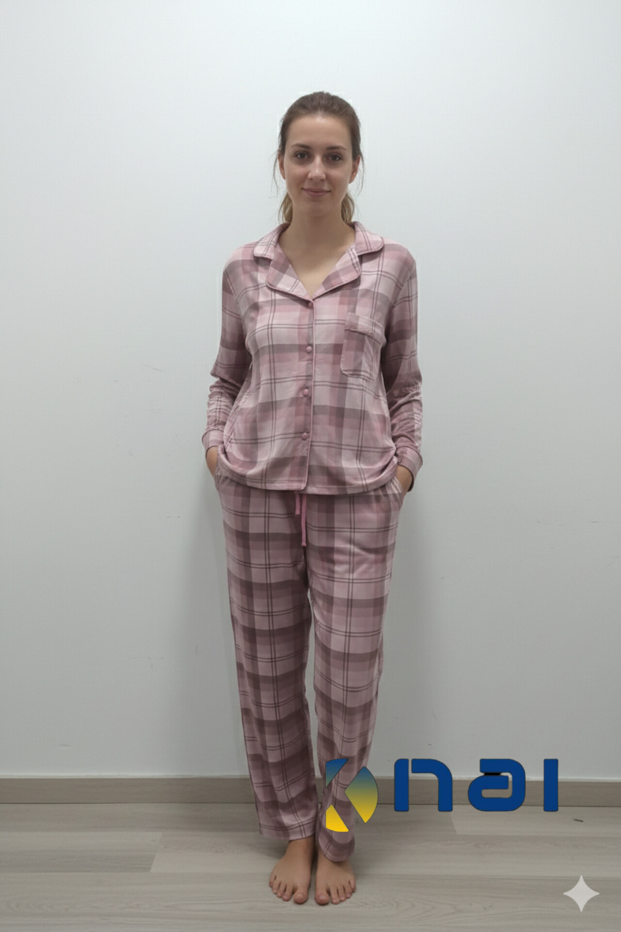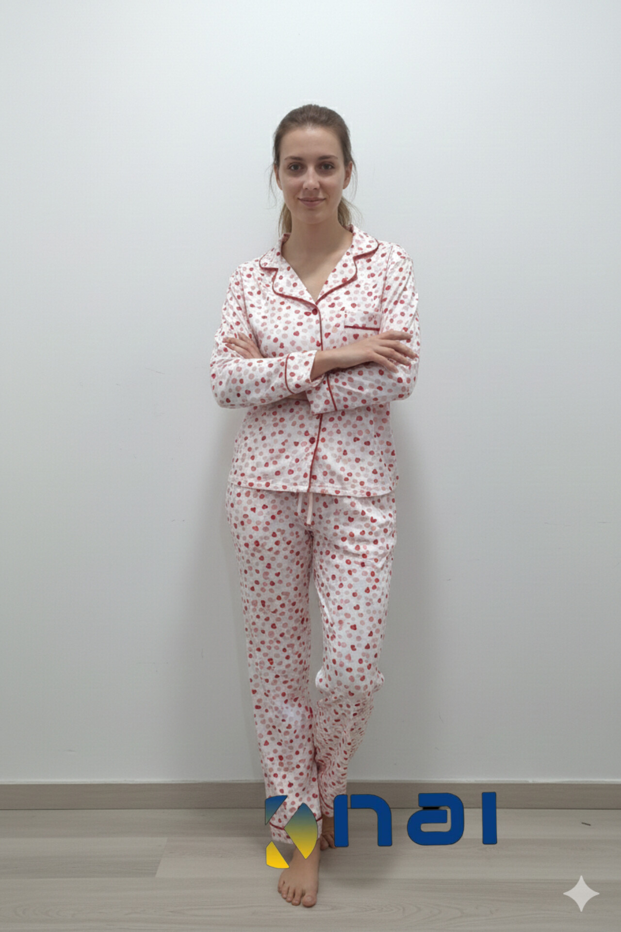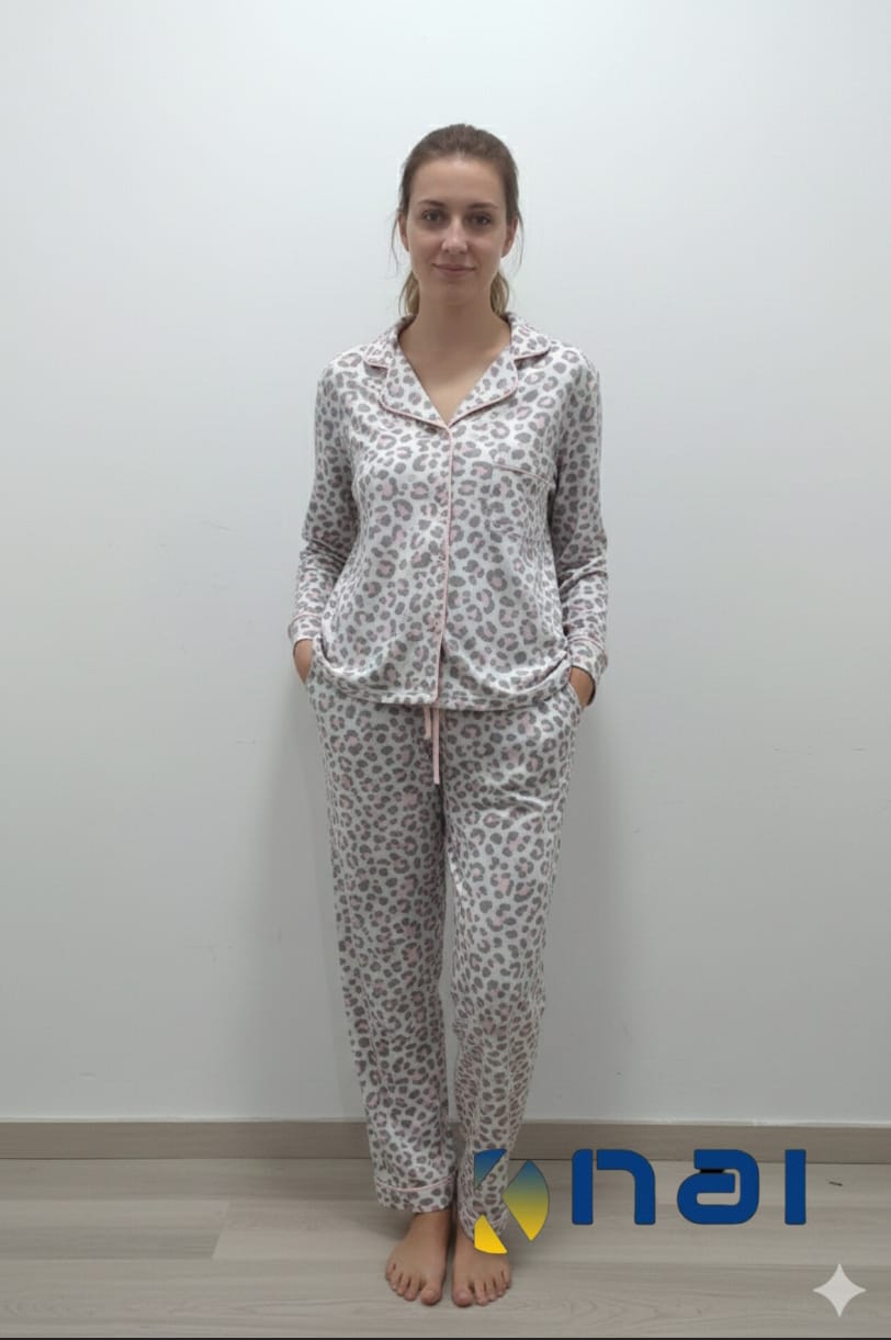 Pijama estilo camiseiro, confeccionado em malha modal estampada, com ligeira carda.