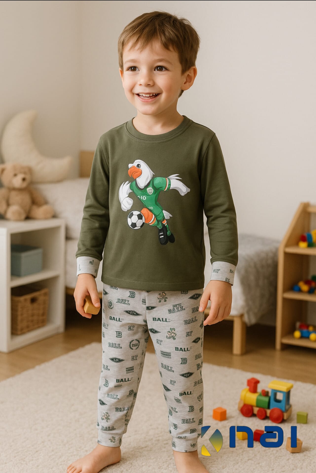 Pijama em malha cardada 100% algodão de excelente qualidade. Malha bem grossinha e carda densa.Camisola com desenho alusivo ao "Futebol" na frente e punho nas mangas. Calça estampada com o tema da camisola, elástico no cós e punhos nas pernas.