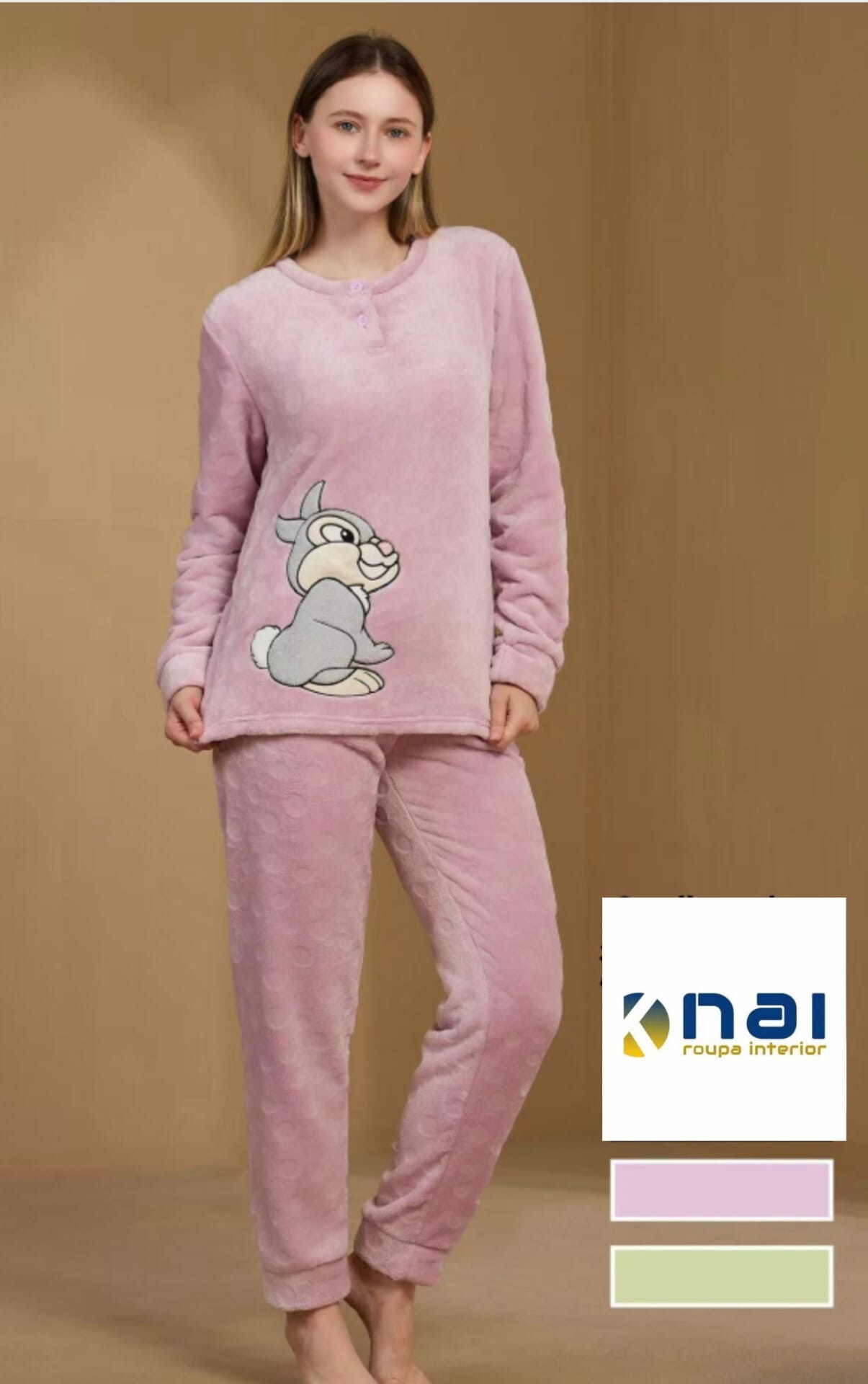 Pijama em malha coralina antialérgica muito fofinho e quentinho. Malha trabalhada com efeito de bolas discretas. Camisola com dois botões, punho nas mangas e bordado muito fofo também ele em coralina. Calças com elástico no cós e punhos nas pernas.