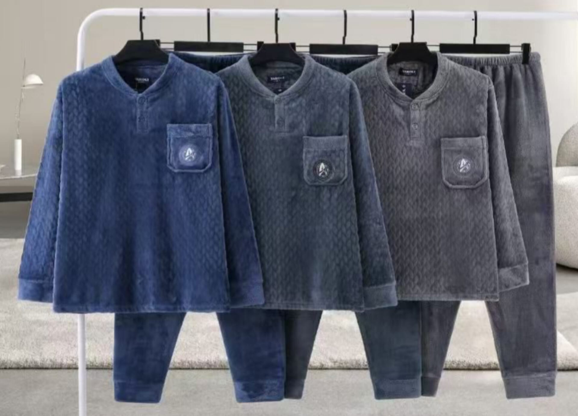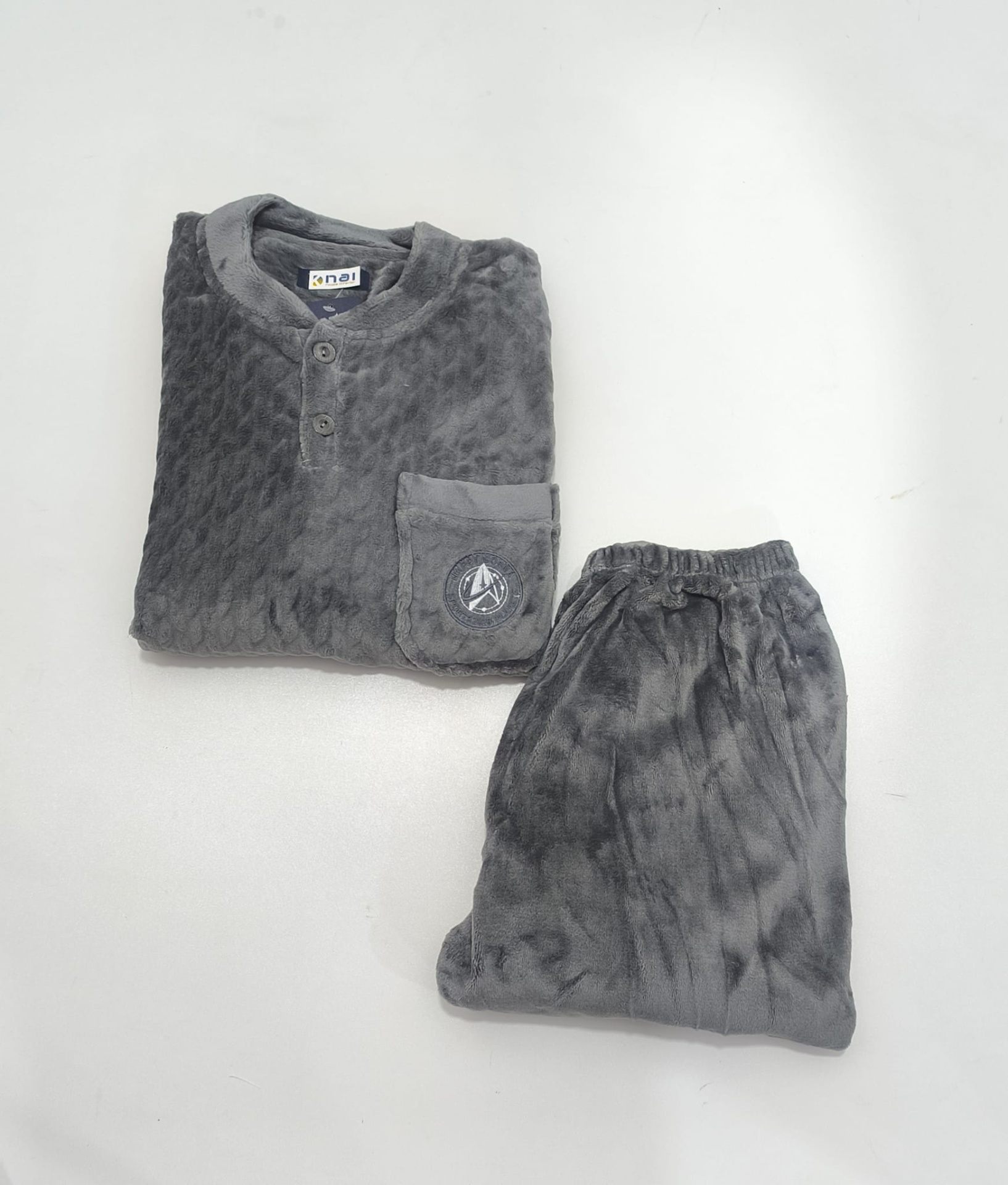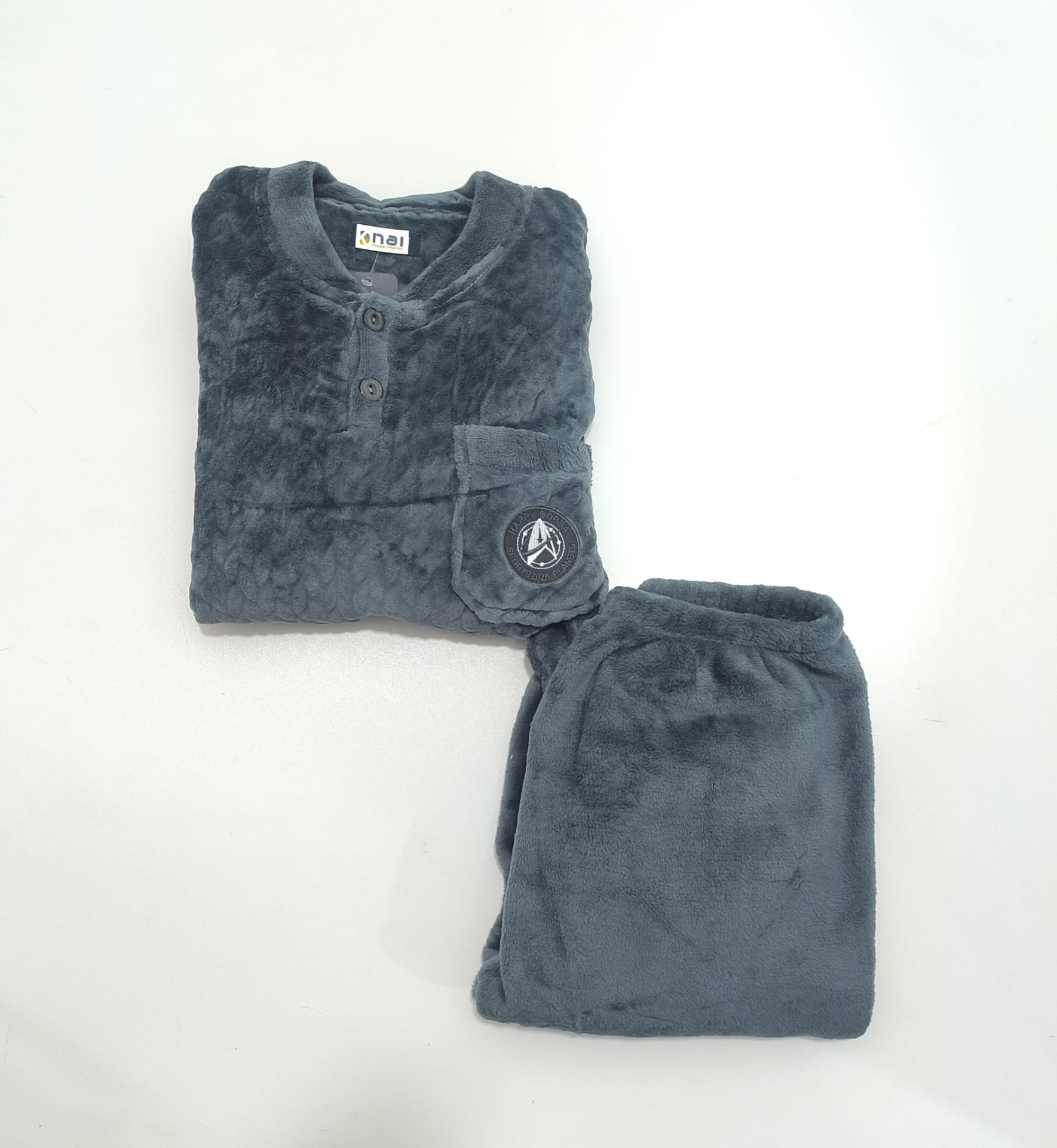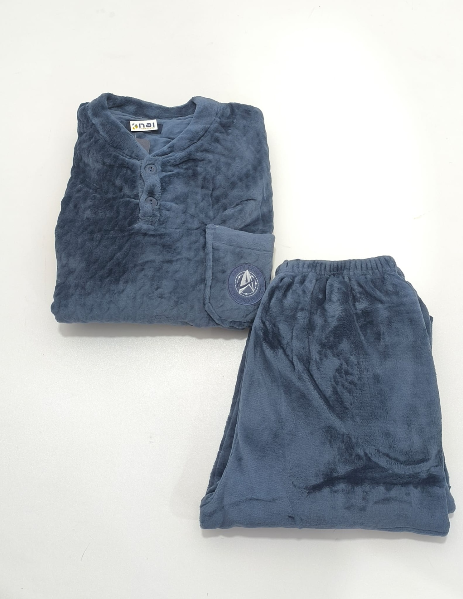 Pijama em malha coralina antialérgico de excelente qualidade. Camisola com dois botões, punhos nas mangas e bolso lateral onde inclui um bordado discreto. Calças com elástico no cós e punhos nas pernas.