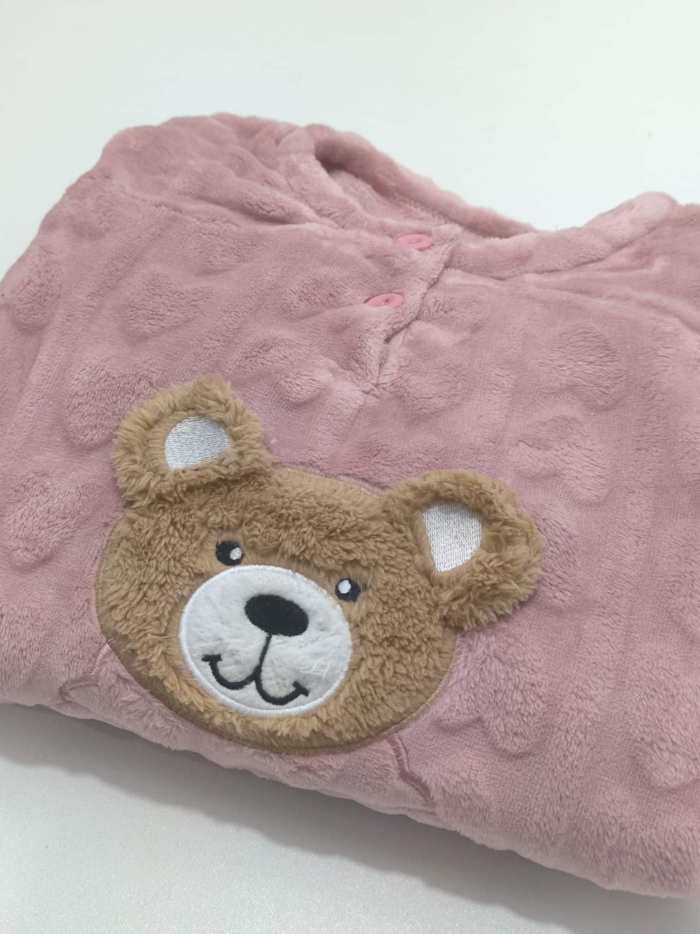 Pijama em malha coralina antialérgica muito fofinho e quentinho. Malha trabalhada em corações discretos.Camisola com dois botões, punho nas mangas e bordado muito fofo em pelúcia 3D. Calças com elástico no cós e punhos nas pernas.
