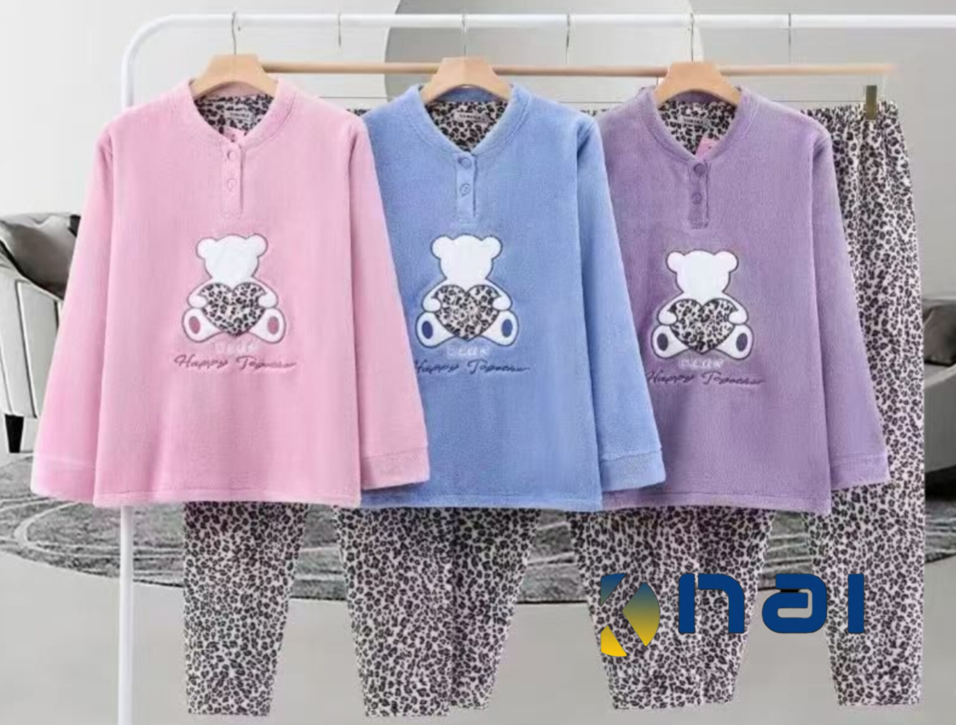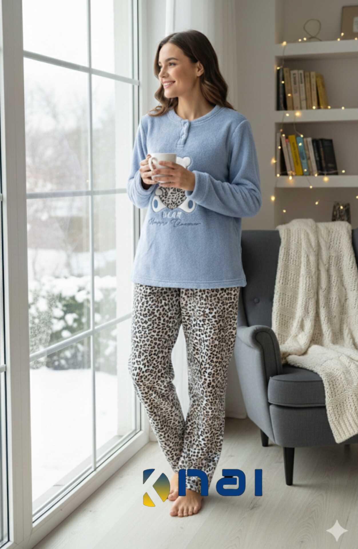 Pijama em malha coralina antialérgica muito fofinho e quentinho. Malha bem densa. Camisola com dois botões, punho nas mangas e bordado muito fofo também ele em coralina. Calças estampa "tigresa" com elástico no cós e punhos nas pernas.