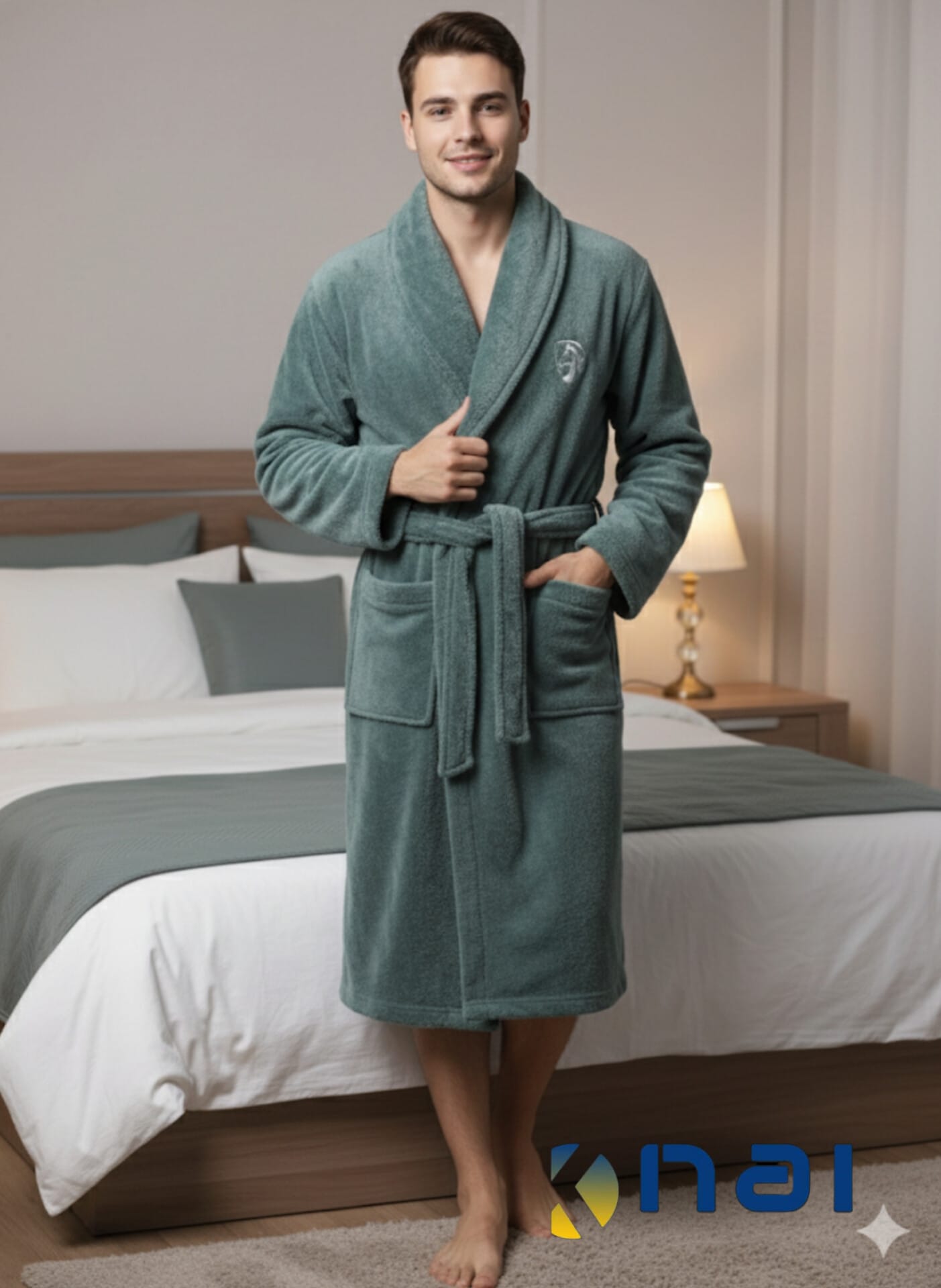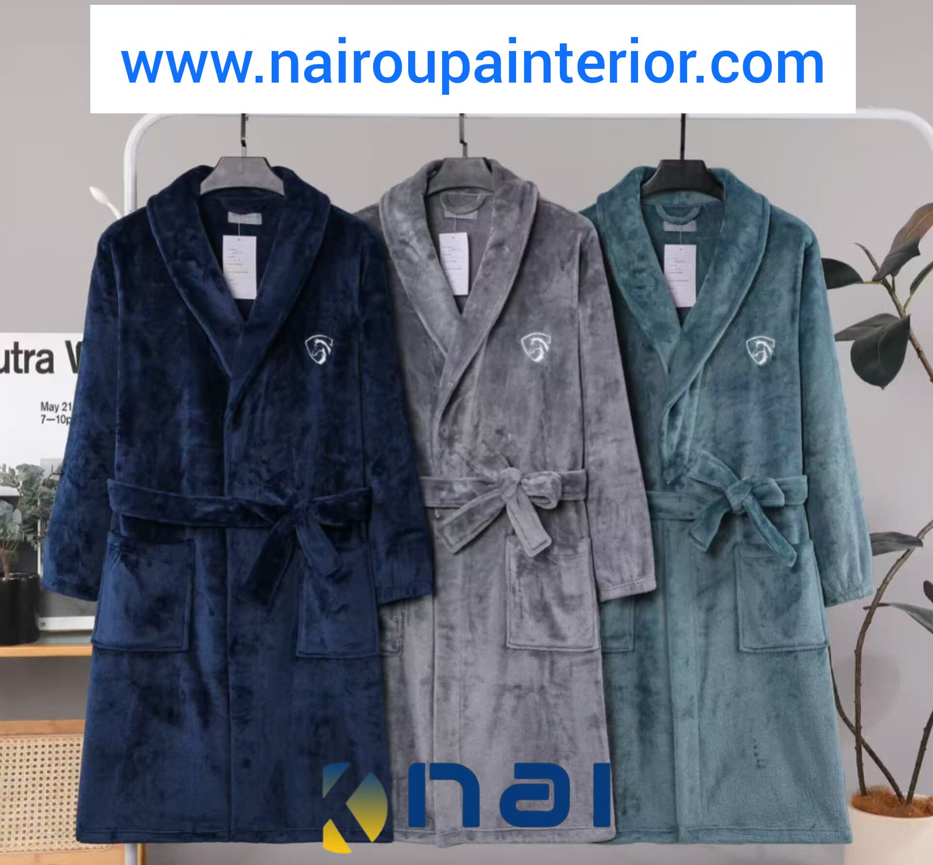 Robe em malha coralina muito macia e quentinha. Modelo de trespasse com cinto para ajustar. Dois bolsos frontais. Bordado discreto no peito. Punho na manga.